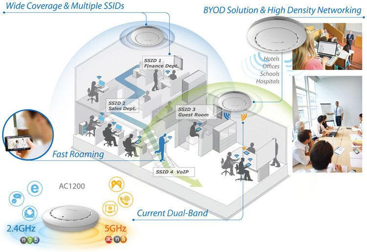 Zariadenie Edimax CAP1200 má rozhranie Wi-Fi s podporou štandardu 802.11a/b/g/n/ac, ktorý mu umožňuje pokryť frekvenčné pásma 2.4 + 5 GHz. Ide teda o takzvanú prevádzku Dual-Band, pri ktorej môže zariadenie pracovať v oboch frekvenčných pásmach súčasne bez toho, aby sa pásma navzájom obmedzovali. Ide o najrýchlejší štandard 802.11ac pracujúci na frekvencii 5 GHz, kde môže ponúknuť veľmi vysoké rýchlosti. Presná rýchlosť závisí od počtu a typu bezdrôtových antén, ale stále sa nevyrovná gigabitovému sieťovému káblu.