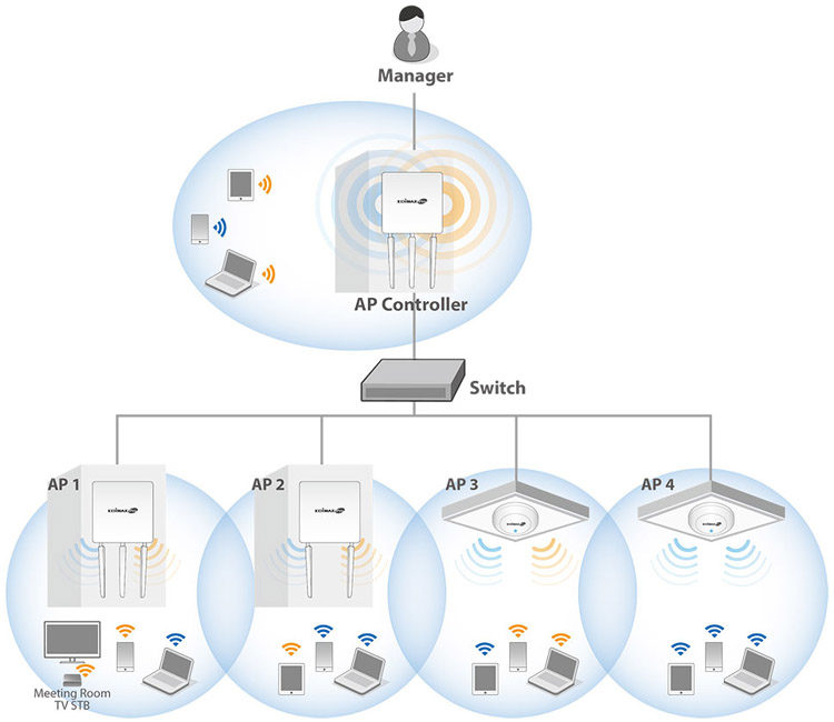 Edimax Pro NMS používa architektúru AP Array, ktorá umožňuje centralizovanú správu viacerých prístupových bodov. Systém NMS môže byť nainštalovaný na jednom zariadení a umožňuje riadiť 8 prístupových bodov Edimax Pro, čím sa eliminuje potreba radičov. Prístupové body je možné inštalovať a konfigurovať v závislosti od vašich potrieb, čím sa vytvorí sieť, ktorá sa dá ľahko spravovať a v budúcnosti rozšíriť.