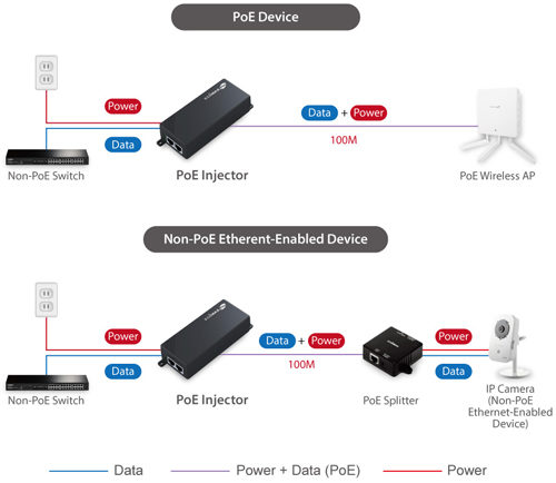 Rozdeľovač umožňuje súčasný prenos dát a energie pre vhodné zariadenia v súlade so štandardmi 802.3af/at pomocou ethernetových káblov. To uľahčuje budovanie infraštruktúry zariadení PoE bez potreby zakúpenia ďalšieho prepínača PoE.