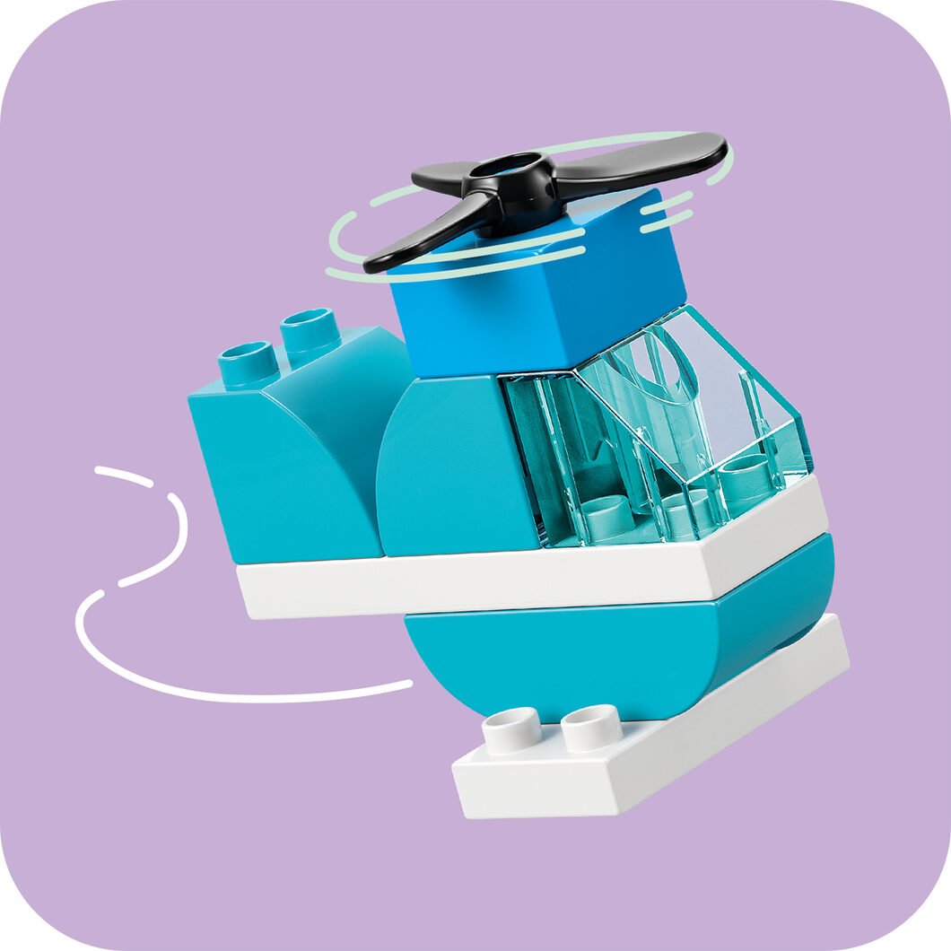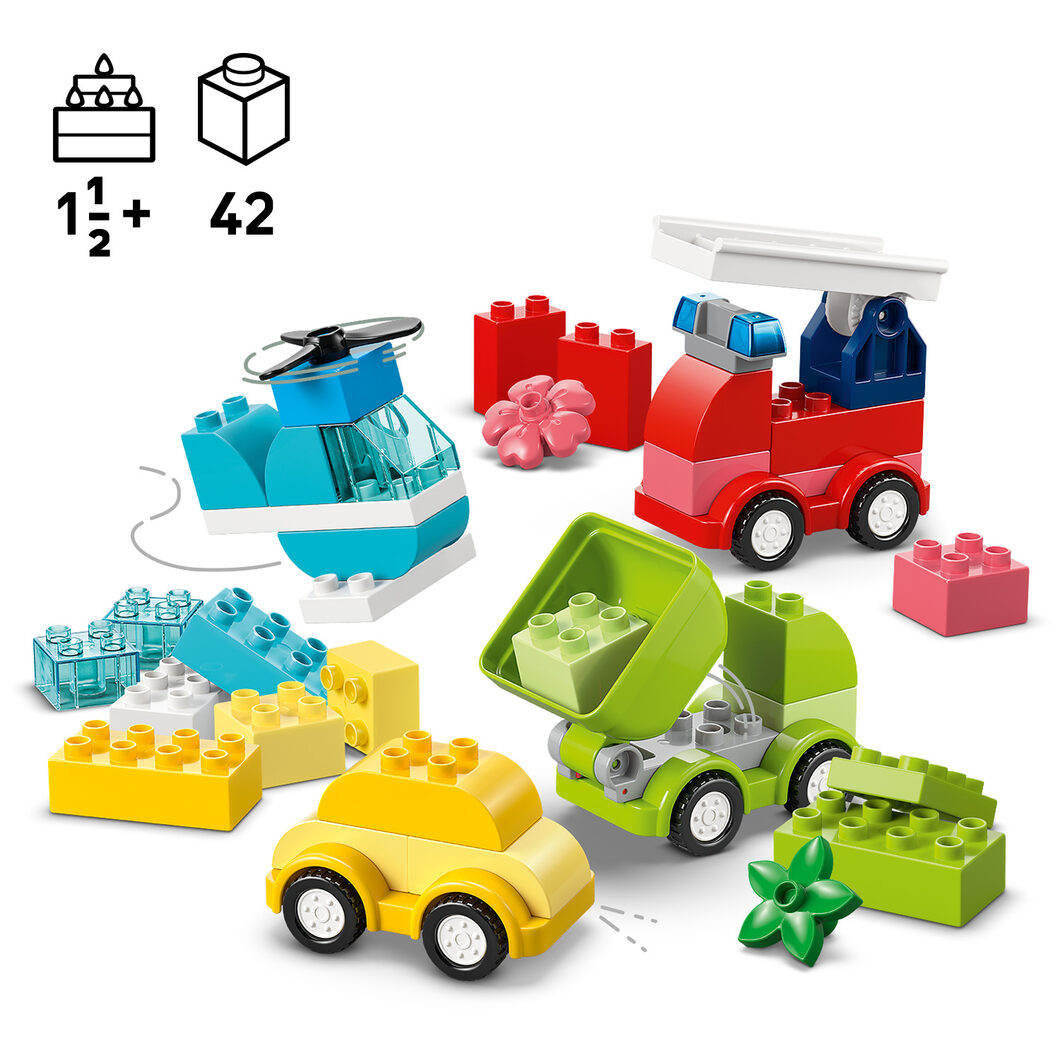 - VOZIDLÁ Z CESTY - Hlavné modely v súprave pre batoľatá obsahujú malé autíčko, vrtuľník LEGO® DUPLO® s otáčajúcou sa vrtuľou, nákladné auto so skladacou korbou, hasičské auto s rebríkom a ďalšie