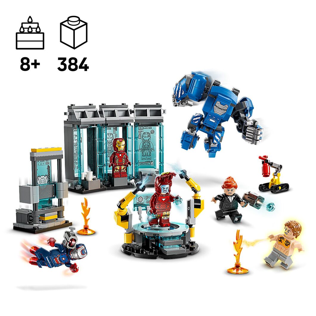 Táto súprava LEGO | Marvel obsahuje 3 sady brnení a 3 minifigúrky brnení Iron Mana: MK1, MK43 a MK6. Súpravu dopĺňajú minifigúrky Pepper Potts a zloducha Aldricha Killiana, zostaviteľný robot Dum-E a veľké robotické brnenie Igor Iron Man MK3 s pohyblivými rukami a nohami a kokpitom s miestom pre minifigúrku. medzi ďalšie funkcie patrí údržbárska plošina s 2 robotickými ramenami a veľké skenovacie zariadenie. K dispozícii je hasiaci prístroj a 2 ohnivé figúrky a 2 vystreľovače pre akčné súboje. Pre ešte viac digitálnej zábavy môžu stavitelia zväčšovať a otáčať modely v 3D a sledovať svoj postup pomocou zábavnej a intuitívnej aplikácie LEGO Builder. Model obsahuje 379 dielikov.