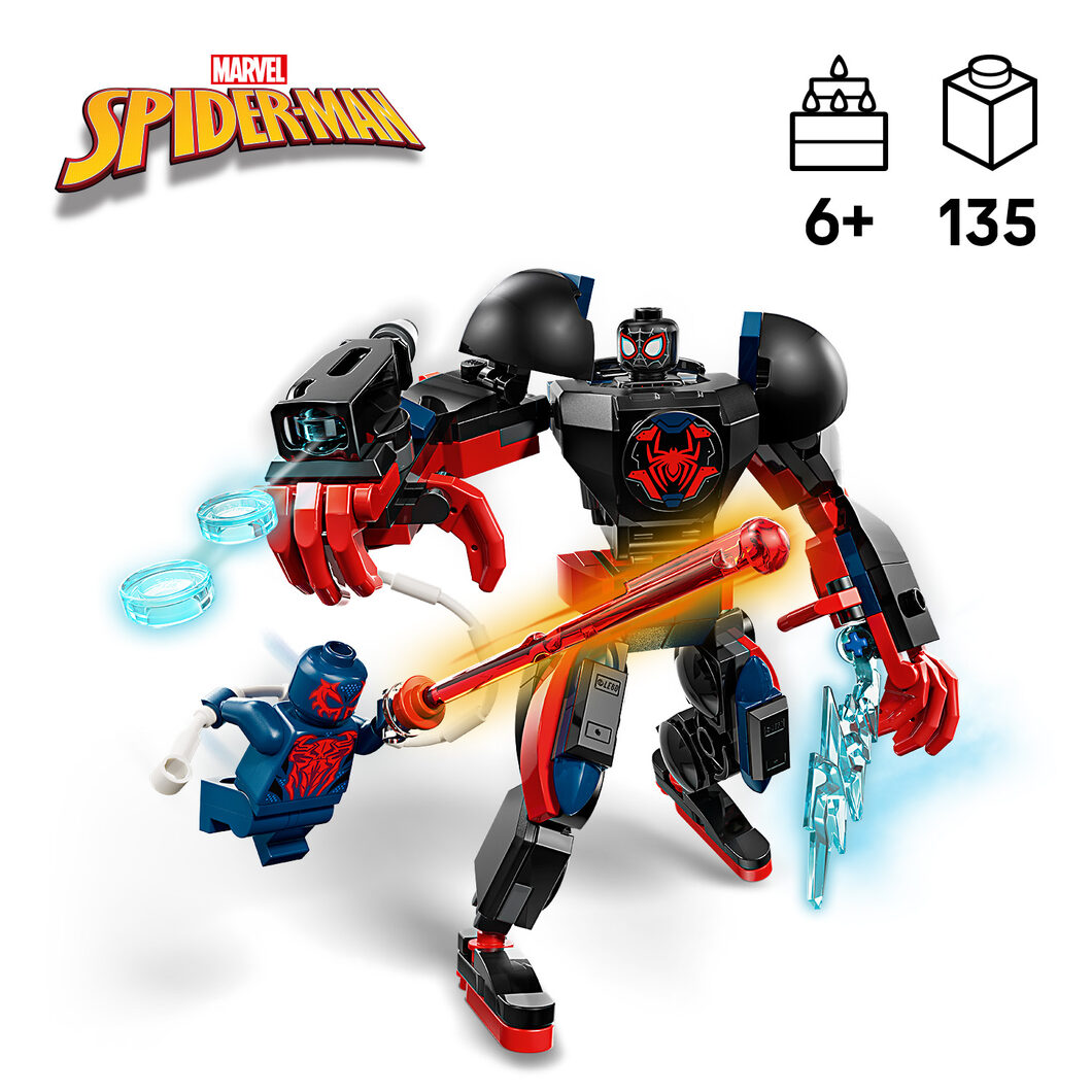 Pripomeň si veľkolepé akčné súboje z filmov od Marvelu so superhrdinským setom Miles Morales Robot vs. Spider-Man 2099 (76337) pre chlapcov a dievčatá od 6 rokov. Táto súprava obsahuje veľkého pohyblivého robota a minifigúrky Spider-Mana Milesa Moralesa, ktoré deti inšpirujú k nekonečnej hre na hrdinov. Táto súprava z radu LEGO® | Marvel obsahuje pohyblivého robota na dynamické hranie a deti si vďaka nej pripomenú akčné scény z filmu Spider-Man: Cez paralelné svety. Na rukách r obota nájdete odnímateľný trojitý vystreľovač, pavučinové lano a ostré výbušné projektily, ktoré prinesú nepretržité akčné bitky. Minifigúrka Spider-Mana 2099 sa bráni ručným laserovým lúčom. Táto súprava je skvelým narodeninovým darčekom pre malých superhrdinov, fanúšikov filmov Marvel a zberateľov predmetov Spider-Man. A deti môžu stavať s istotou vďaka aplikácii LEGO Builder - približujte a otáčajte model v 3D a sledujte postup pomocou zrozumiteľných digitálnych pokynov. Stavebnica obsahuje 135 dielikov.