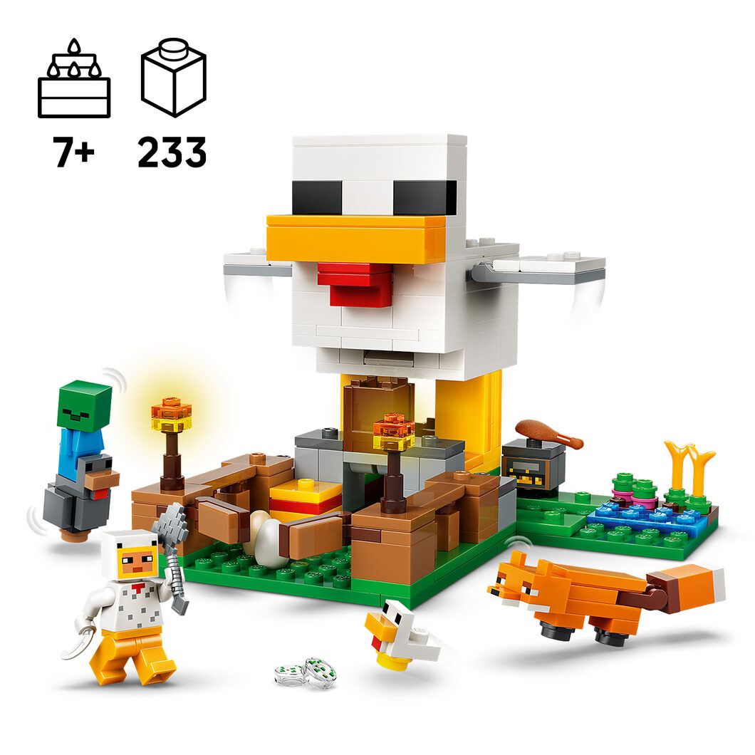 - STAVEBNICA NA VIDEOHODINÁCH - S touto stavebnicou LEGO® Minecraft® si užiješ hodiny hrania pri starostlivosti o kurčatá, preskúmaš množstvo zábavných prvkov v kurníku a ubrániš sa malému zombiemu, ktorý sa snaží jazdiť na kurčati