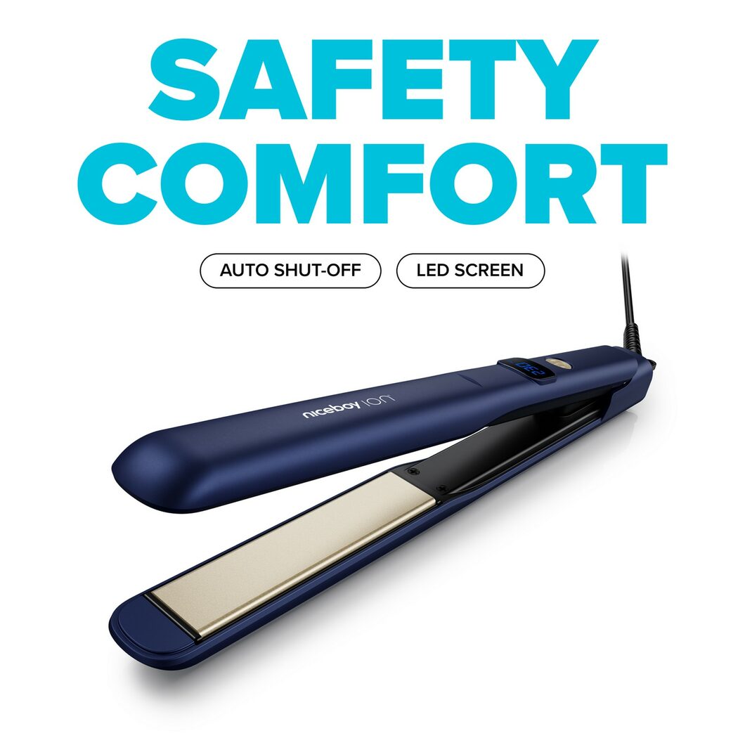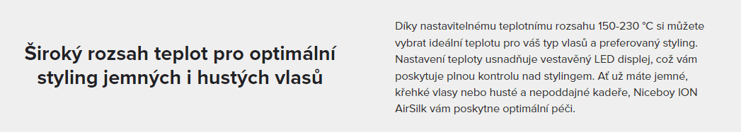 | Niceboy ION AirSilk vám vďaka 1,8 m dlhému káblu poskytuje dostatok voľnosti pohybu. | Pre maximálnu bezpečnosť počas používania sa žehlička Niceboy ION AirSilk po čase nečinnosti sama vypne. | Žehlička Niceboy ION AirSilk je vybavená čitateľným LED displejom pre presné nastavenie teploty. |