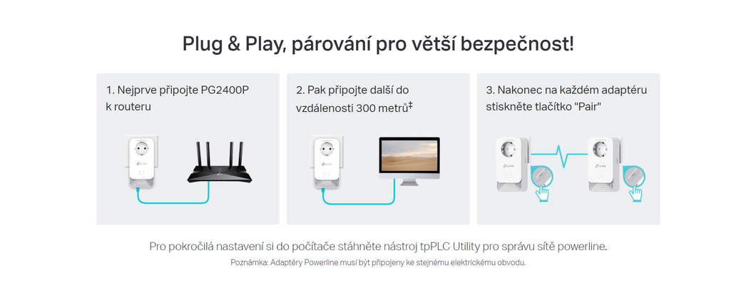 - Plug & Play pre pokrytie celej domácnosti - až 300 m cez existujúce elektrické vedenie.‡