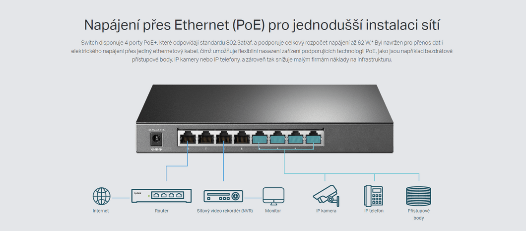 - PoE s rozpočtom výkonu 62 W: 4 porty PoE+ kompatibilné so štandardom 802.3at/af s celkovým rozpočtom výkonu 62 W*.