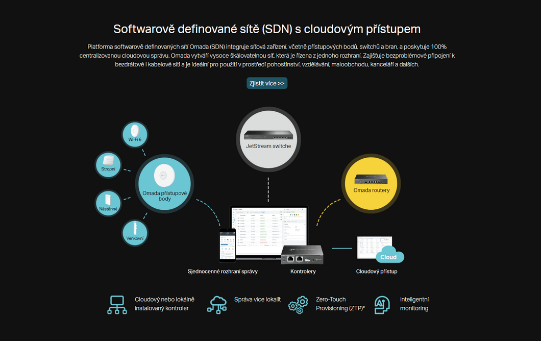 *Funkcia ZTP (Zero-Touch Provisioning) vyžaduje použitie cloudového kontroléra Omada. Všetky modely podporované cloudovým radičom Omada nájdete na stránke www.tp-link.com/cz/omada-cloud-based-controller/product-list/.