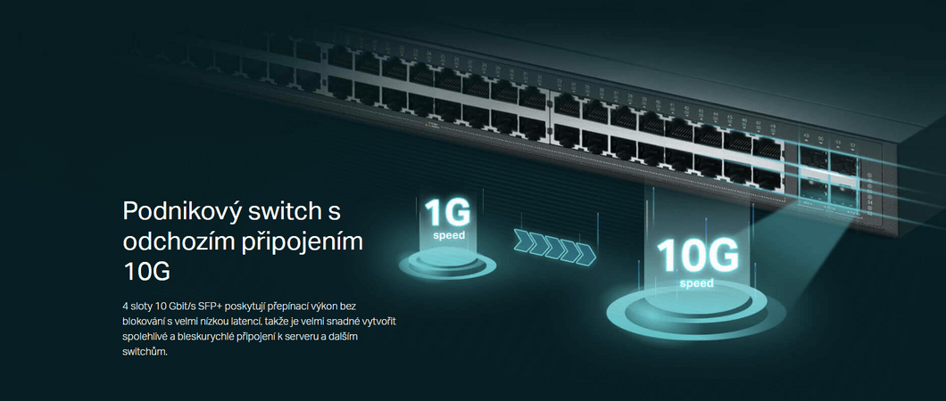 - Gigabitové rýchlosti: 48 gigabitových portov RJ45 ponúka vysokorýchlostné a spoľahlivé pripojenie k iným prepínačom a zariadeniam.