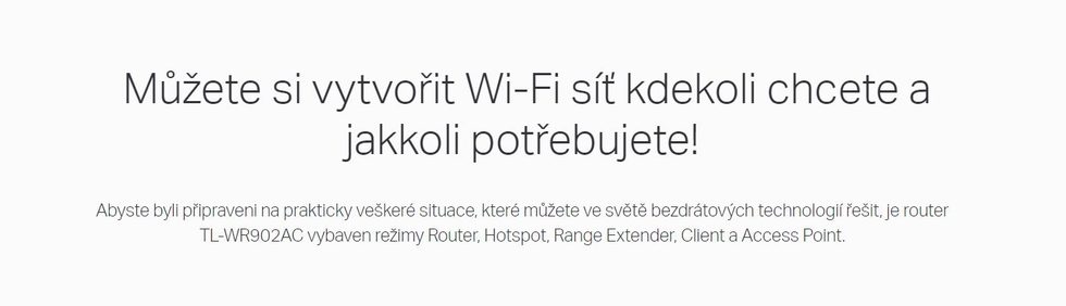 TP-LINK TL-WR902AC je mobilné, prenosné a spoľahlivé zariadenie so zabudovanou batériou určené na cestovanie. Vstavaná batéria dokáže udržať zariadenie v prevádzke niekoľko hodín v závislosti od typu záťaže. Pri používaní v exteriéri dbajte na ochranu zariadenia pred dažďom a zvýšenou vlhkosťou, ktoré by mohli spôsobiť jeho poškodenie. Ide o multifunkčné zariadenie, pri ktorom môžete jednoducho prepínať medzi sieťovými režimami pomocou jediného tlačidla. Prehľad jeho funkcií si môžete prečítať nižšie. Preto možno zariadenie TP-LINK TL-WR902AC odporučiť pre: