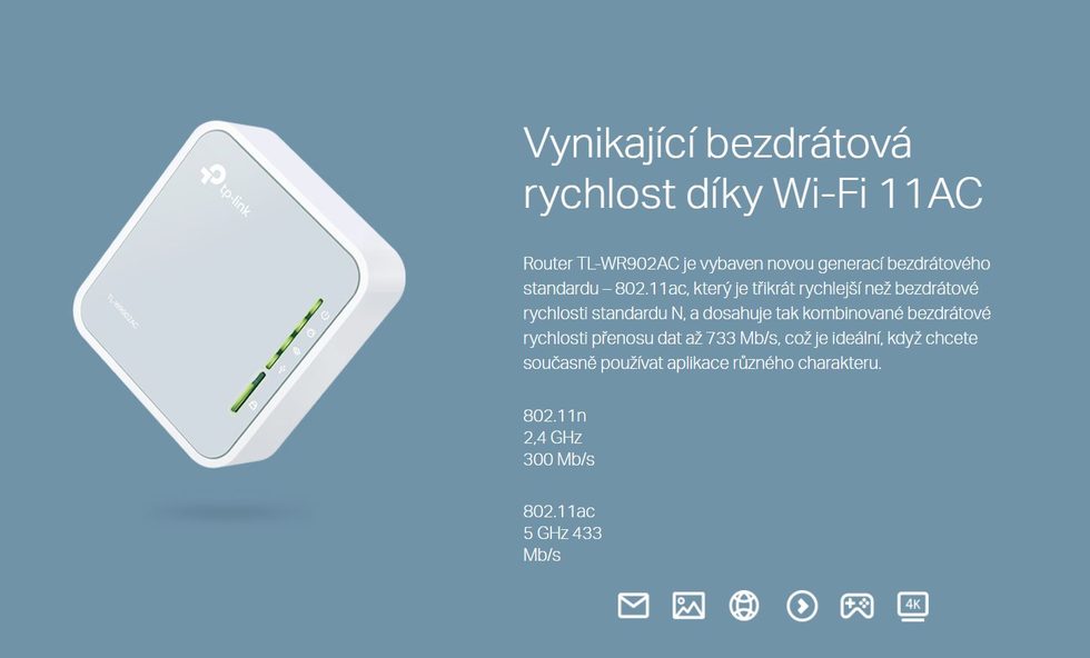 Prenosová rýchlosť bezdrôtovej siete závisí od použitého štandardu 802.11a/b/g/n/ac a frekvenčného pásma 2.4 + 5 GHz. Prenosová rýchlosť Wi-Fi zariadenia TP-LINK TL-WR902AC je veľmi dobrá 300 Mb/s v najčastejšie používanom pásme 2,4 GHz a v rýchlom pásme 5 GHz je vynikajúca 433 Mb/s.