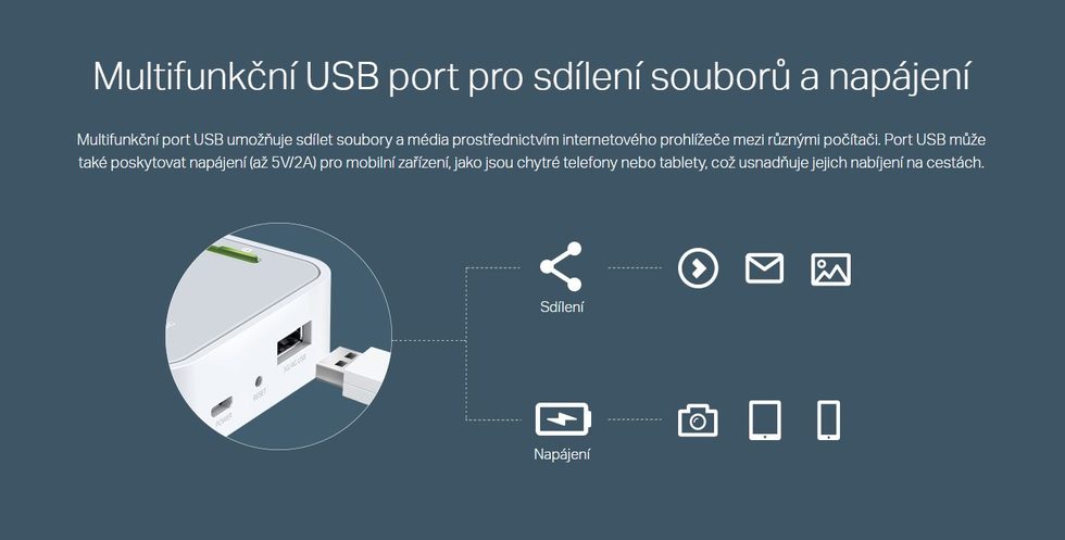 Potrebujete rozšíriť sieť o zdieľanú tlačiareň, externý disk alebo flash disk? Nič z toho nebude problém vďaka zabudovanému portu USB. Zariadenie TP-LINK TL-WR902AC vám ponúkne 1x port USB 2.0. Pripojené zariadenia budú po začatí zdieľania k dispozícii v celej vašej domácej sieti. V prípade pripojenia úložiska USB závisí rýchlosť prenosu od typu USB. S novým USB 3.0 bude rýchlosť mnohonásobne vyššia ako pri použití staršieho USB 2.0.
