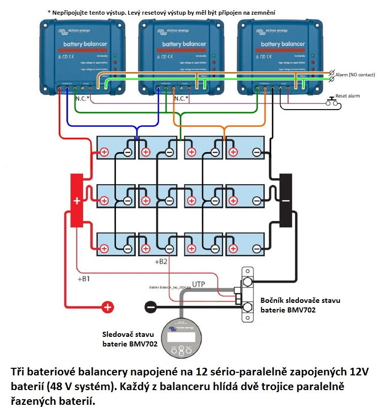 Vyvažovače batérií možno pre zložitejšie systémy usporiadať aj paralelne. Pre48 V systém sa používajúcelkovo tri vyvažovače (pozri schémy).